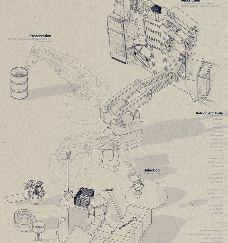 The remaining residents begin to build the Archive of SIlence(s) using a robotic arm, cotton canvas, steel and artifact-embedded concrete-methylcellulose panels in a process that subverts the discriminatory archival system practiced at the National Archives.